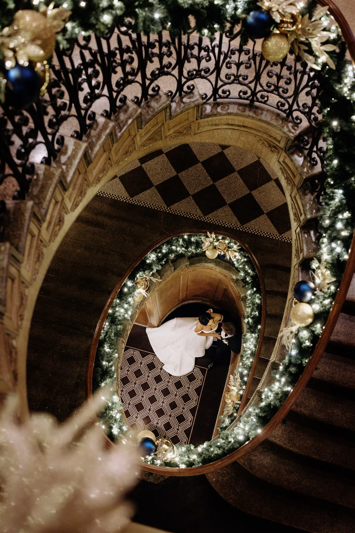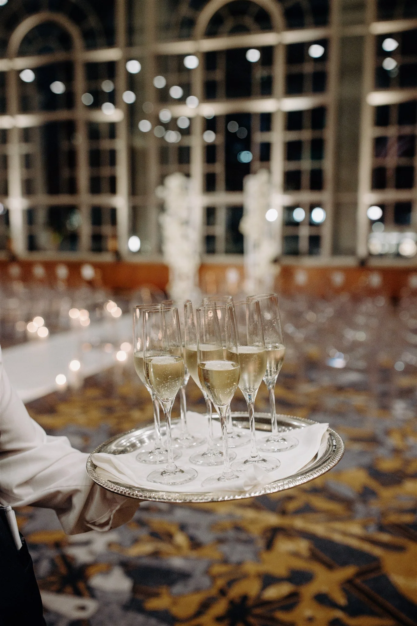 Though their initial vision leaned towards a high-end Brooklyn loft aesthetic, their hearts were captured by the historic charm of The Fairmont during the holiday season. This unexpected shift inspired us to pivot our design approach while staying true to our original goals and intentions. We embraced the grandeur and architectural beauty of the venue, weaving their vision seamlessly into the fabric of its historical backdrop.