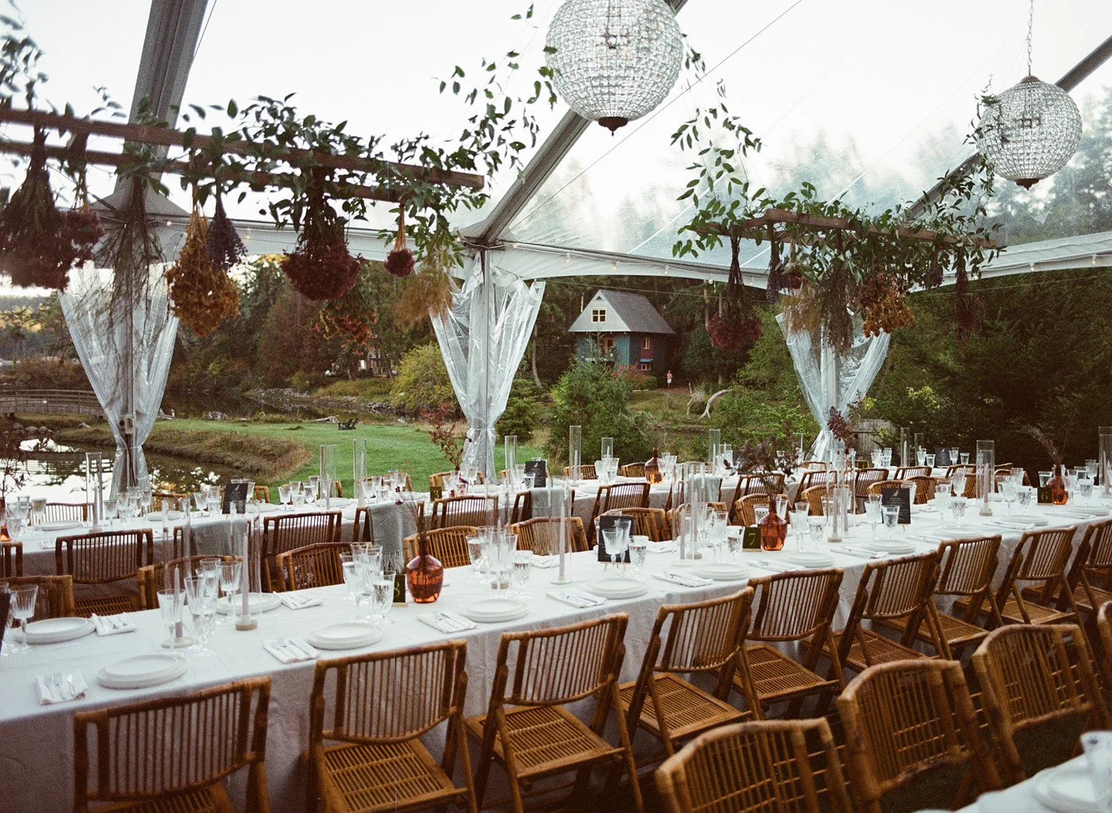 After delving deep into their visions, desires, and must-haves for their event, we stepped into our role and began designing a coastal-style, high-end PNW wedding that would reflect the charming vibe Martha and Charlie were going for. We married thoughtful design elements with fantastic entertainment, making sure that every element enhanced the stunning setting and fostered an atmosphere where every guest could create memories to last a lifetime. We embraced the Filson-style historical lodge vibes at Captain Whidbey, and brought a contemporary indie-chic design perspective to our selection of rentals, florals, and outfits. Color sense really drove the design, and complemented the beautiful nature setting so well.