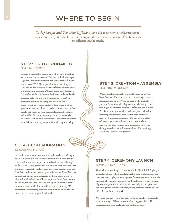 When I was asked to officiate, I felt honored but also clueless about authoring a ceremony—then I was given the Ceremony Writing Guide. It drew out my best creative writer!”