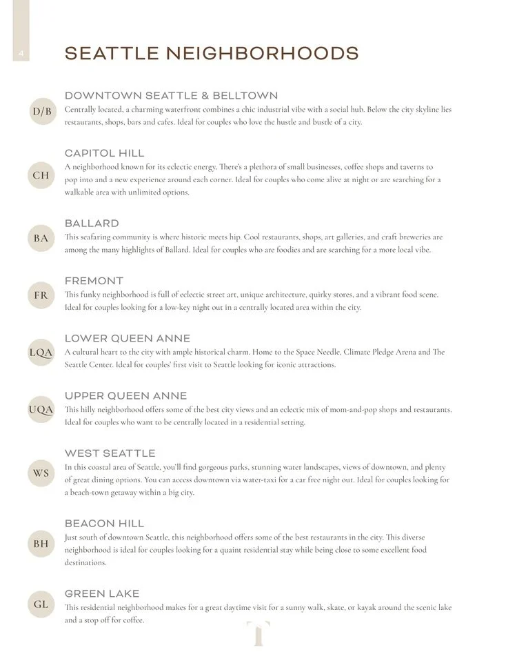 Our team is passionate about the Pacific Northwest and all it has to offer. We love sharing our favorite spots with couples and their guests traveling to Washington to celebrate their marriage. In this guide, you’ll find our team’s recommended restaurants, activities, hikes and more to enhance your adventures around our beautiful city. Use this as your local guide around Seattle, or swipe the copy and share it on your wedding website with any of your beloved guests.